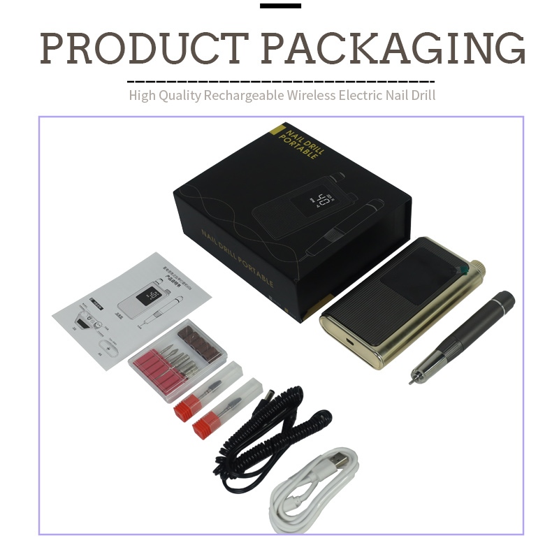В комплект этой высокоскоростной профессиональной дрели для ногтей со скоростью вращения 40 000 об/мин входят шлифовальный карандаш, USB-кабель для зарядки, инструкция по эксплуатации продукта, а также легкая и портативная коробка.