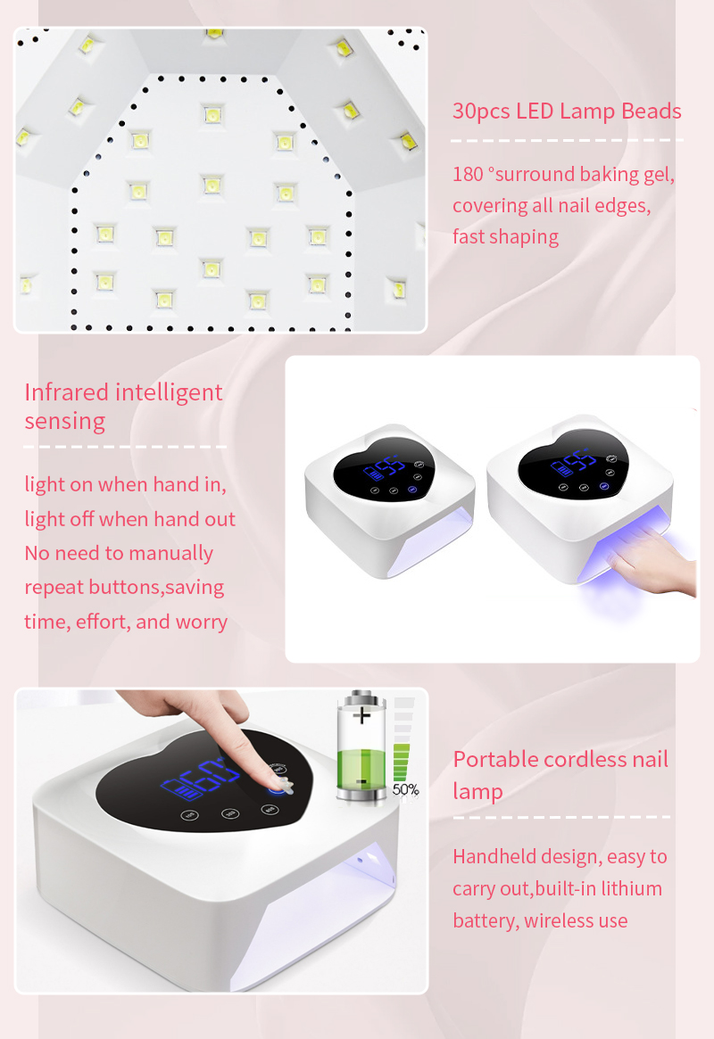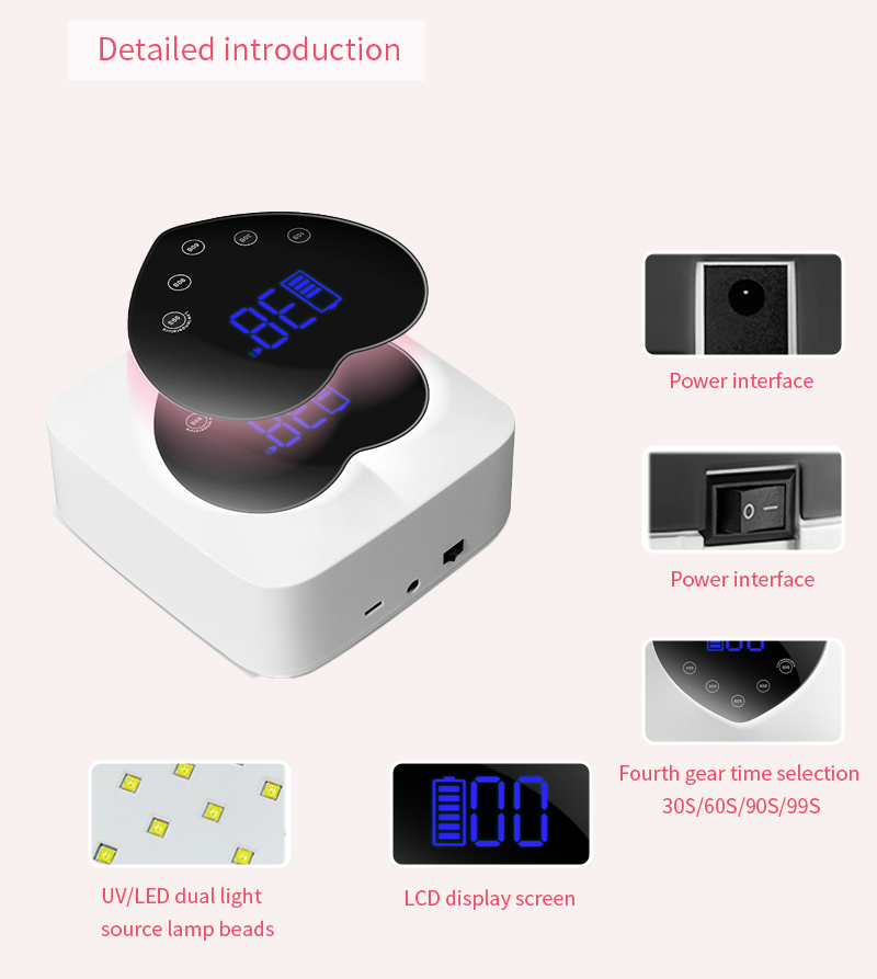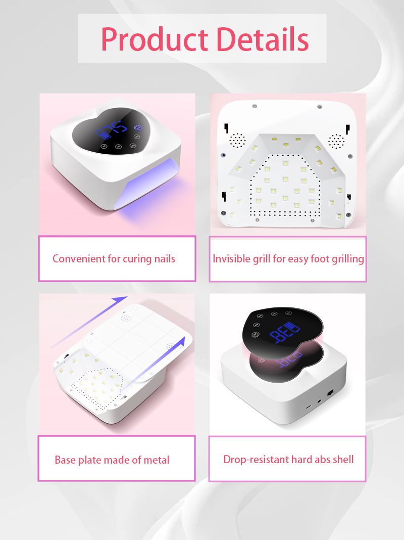 Продукт обеспечивает равномерное высыхание клея без усадки. Двойные источники света обеспечивают мягкий нагрев, предотвращающий изменение цвета рук и напряжение глаз, подходят как для рук, так и для ног, обеспечивая удивительно быстрое высыхание.