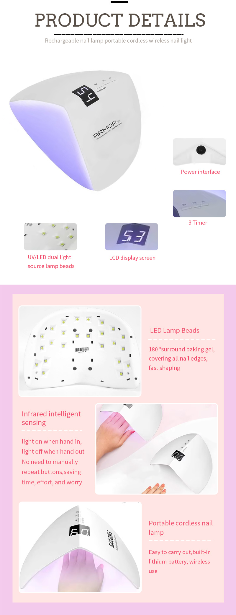 Продукт обеспечивает равномерное высыхание клея без усадки. Двойные источники света обеспечивают мягкий нагрев, предотвращающий изменение цвета рук и напряжение глаз, подходят как для рук, так и для ног, обеспечивая удивительно быстрое высыхание.