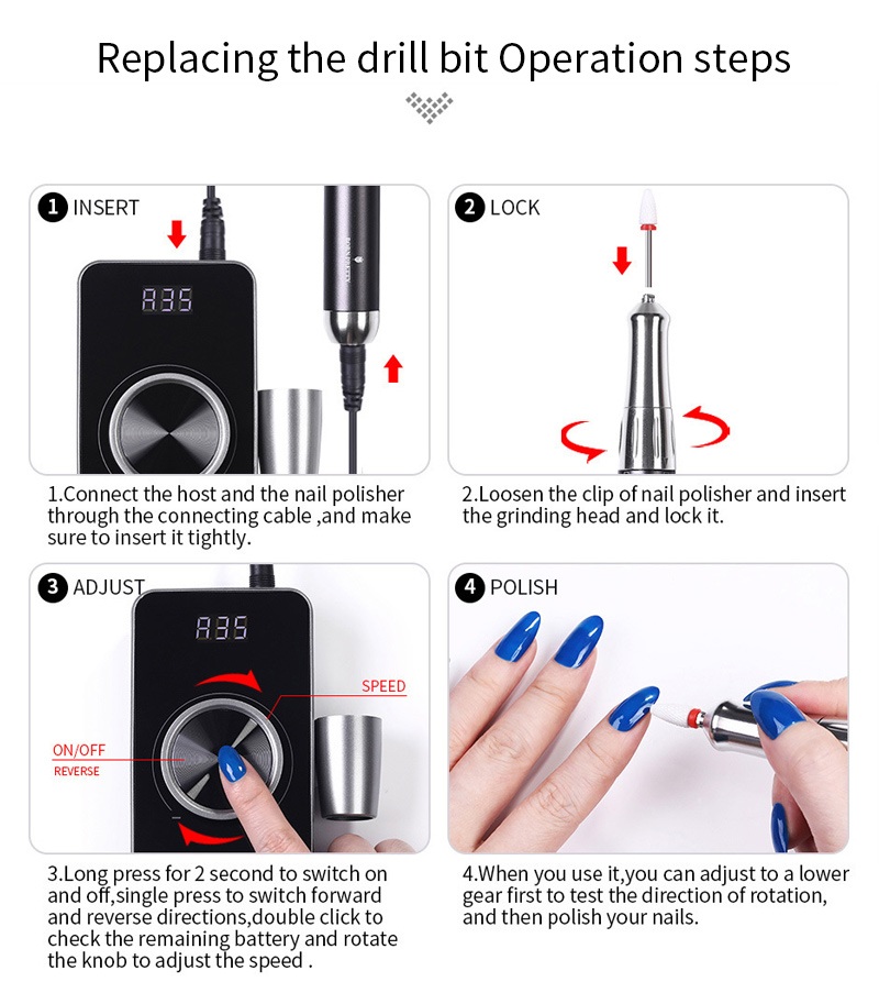Эта отшелушивающая электрическая дрель для ногтей со скоростью 35 000 об/мин доступна в двух цветах на выбор: черный/белый/серый/синий/красный/розовый/оранжевый, яркие цвета.