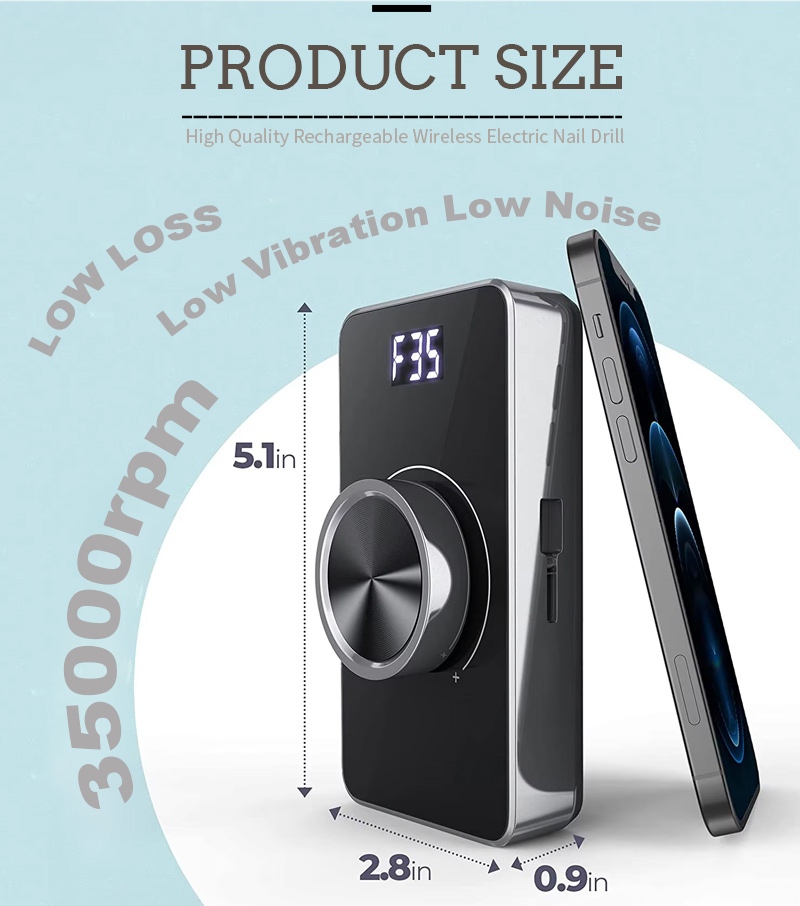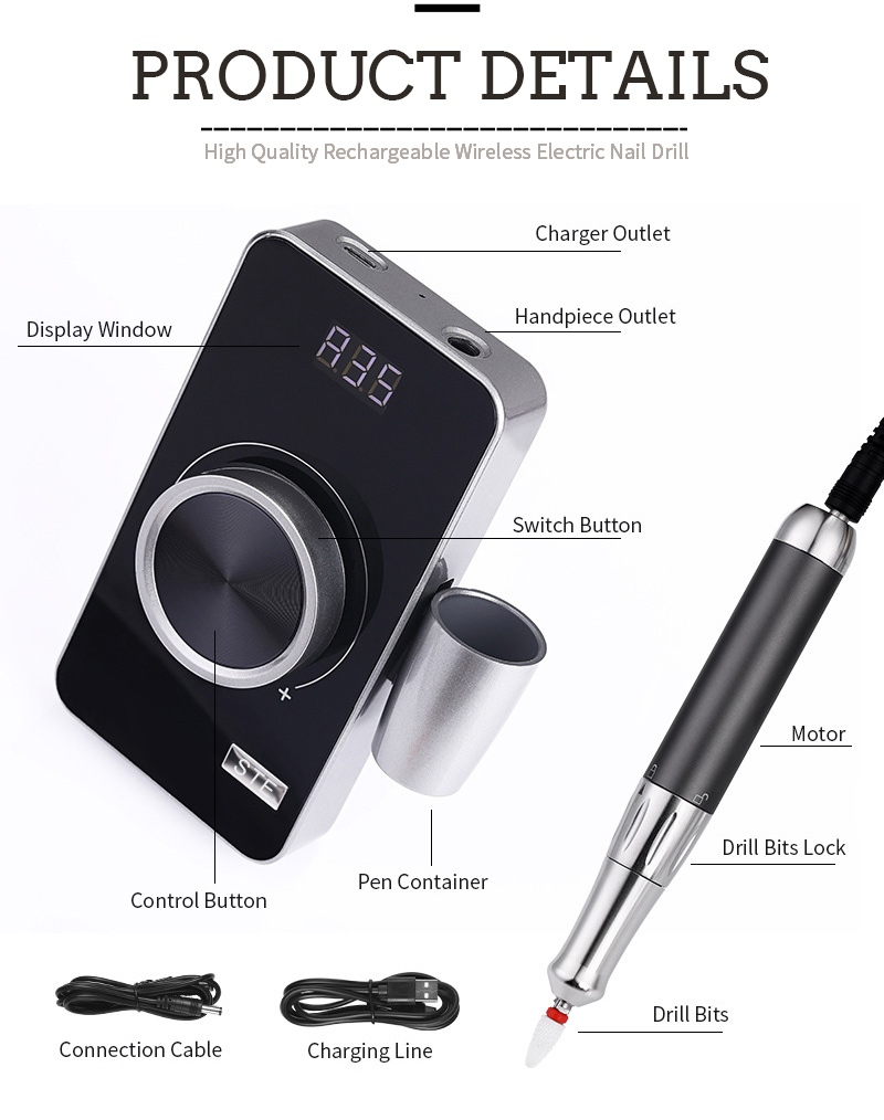 Конструкция дисплея этой отшелушивающей электрической дрели для ногтей со скоростью 35 000 об/мин имеет переключатель включения/выключения и вращение вперед/назад для активации одной кнопкой, гнездо для быстрой зарядки внизу, сменное гнездо для сверла вверху и трехпозиционную регулируемую скорость для удовлетворения различных потребностей.
