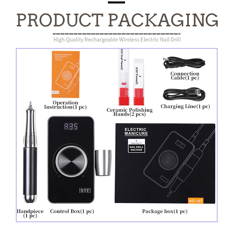 В состав этой отшелушивающей электрической дрели для ногтей со скоростью 35 000 об/мин входят шлифовальный карандаш, USB-кабель для зарядки, инструкция по эксплуатации продукта, а также легкая и портативная коробка.