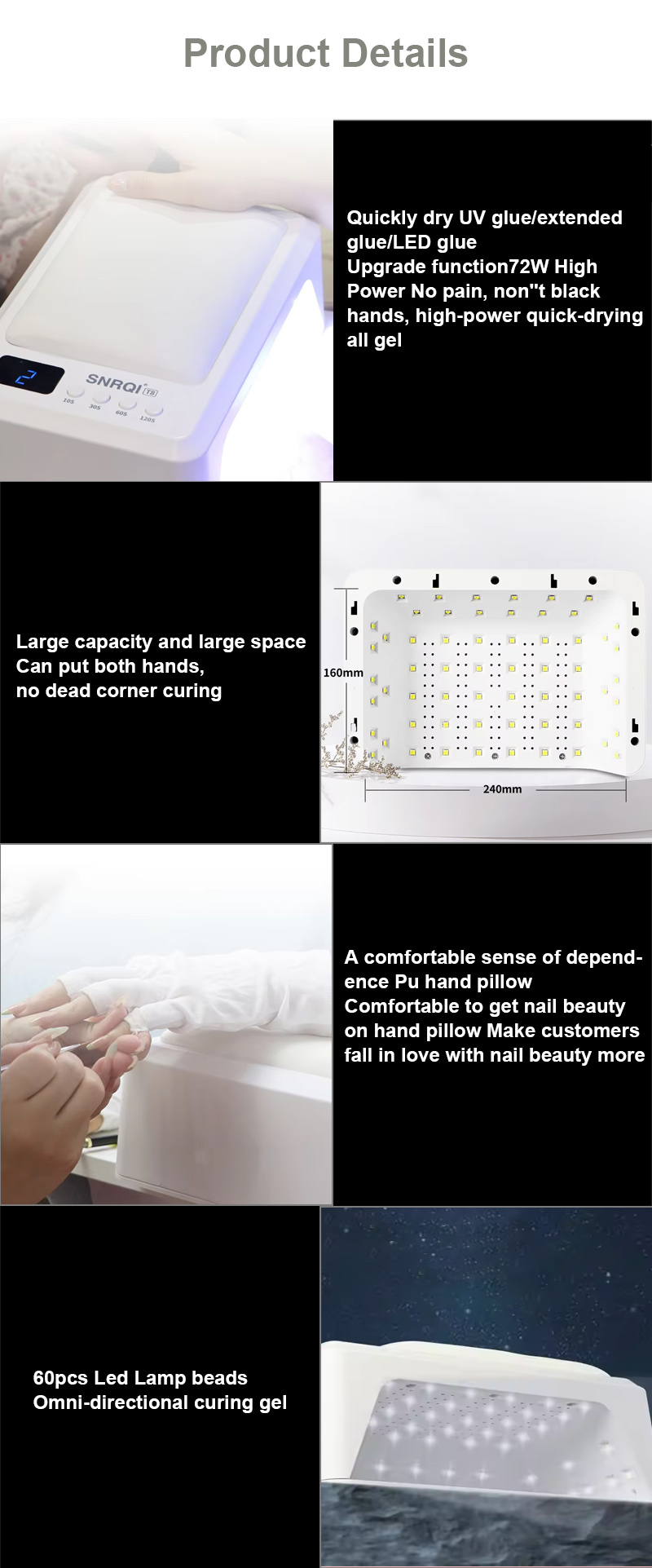 Продукт обеспечивает равномерное высыхание клея без усадки. Двойные источники света обеспечивают мягкий нагрев, предотвращающий изменение цвета рук и напряжение глаз, подходят как для рук, так и для ног, обеспечивая удивительно быстрое высыхание.