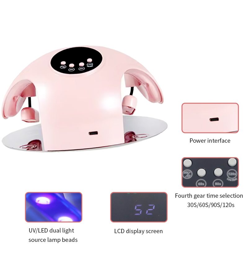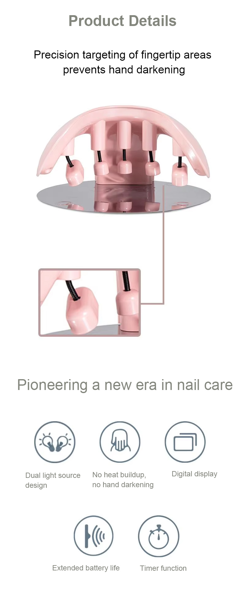 Продукт обеспечивает равномерное высыхание клея без усадки. Двойные источники света обеспечивают мягкий нагрев, предотвращающий изменение цвета рук и напряжение глаз, подходят как для рук, так и для ног, обеспечивая удивительно быстрое высыхание.