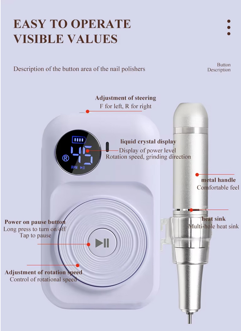 Этот малошумный дисплей премиум-класса с шлифовальной ручкой оснащен гнездом для шлифовальной ручки, жидкокристаллический ЖК-дисплей может отображать количество оборотов/мощность/направление, ручку переключения скорости, кнопку переключения по часовой стрелке/против часовой стрелки, кнопку паузы, профессиональный двигатель со скоростью 30 000 об/мин, шлифовальную головку с винтовой блокировкой.