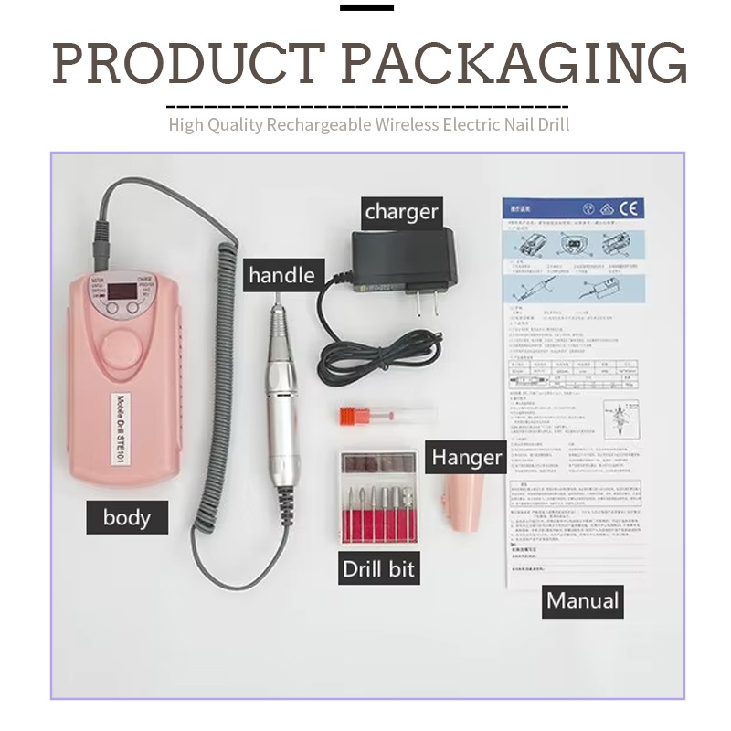 В комплект этой профессиональной беспроводной электрической дрели для ногтей входят шлифовальная ручка, USB-кабель для зарядки, инструкция по эксплуатации и легкая портативная коробка.