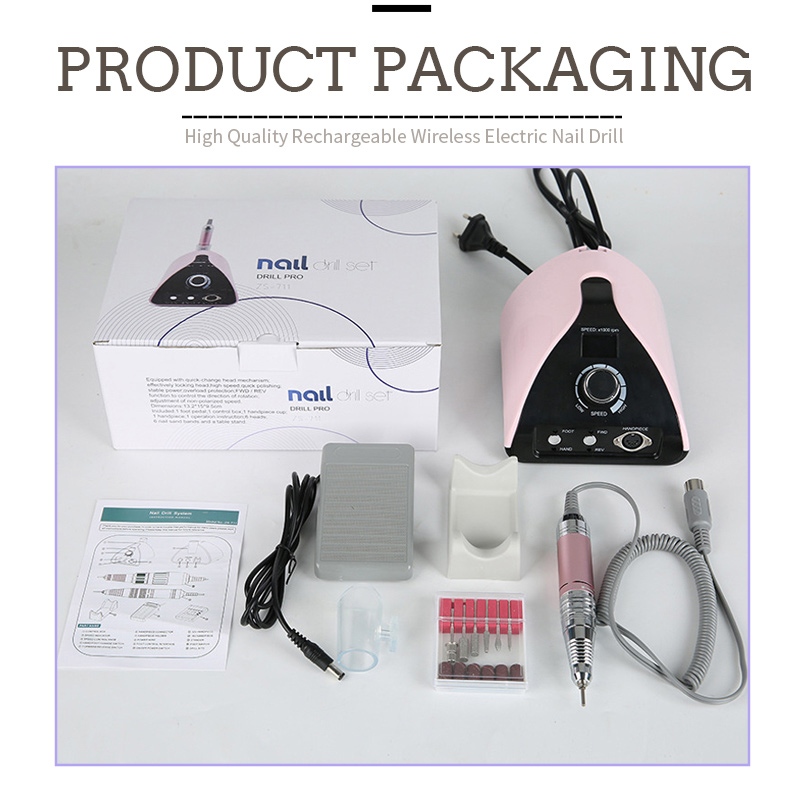 В состав этой профессиональной портативной дрели для ногтей со скоростью 35 000 об/мин входят шлифовальная ручка, USB-кабель для зарядки, инструкция по эксплуатации, а также легкая и портативная коробка.