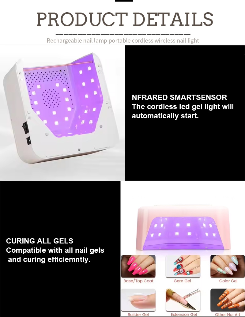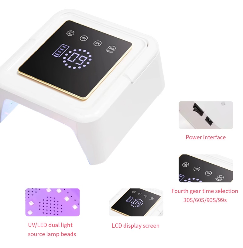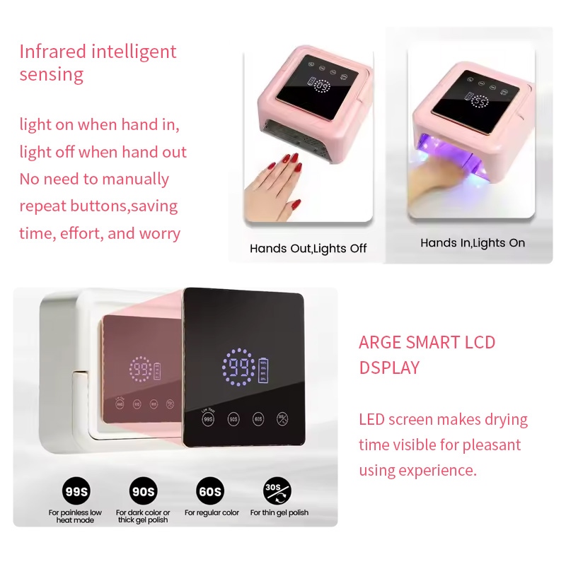 Квадратная лампа для сушки ногтей оснащена технологией интеллектуального инфракрасного обнаружения, которая автоматически загорается при приближении рук и выключается, когда руки удаляются, что устраняет необходимость многократного нажатия кнопок и экономит время и усилия. Высокоэффективный клей для выпечки не требует длительного ожидания, экономя время и силы.