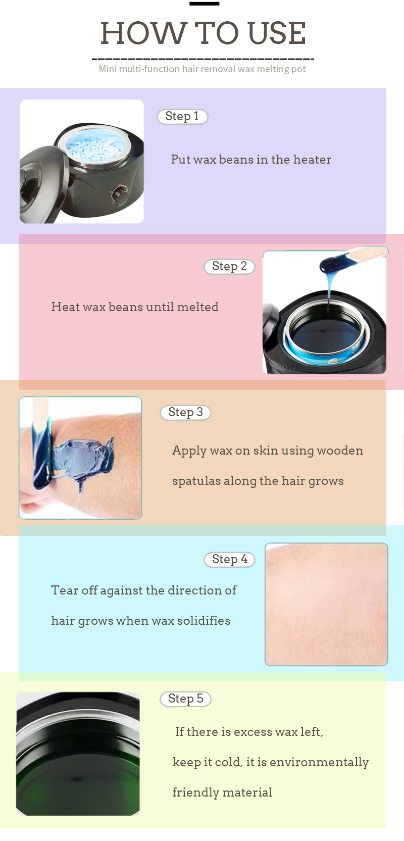 Метод работы продукта с воском для депиляции: чем выше температура, тем быстрее плавится воск, чем ниже температура, тем медленнее плавится воск, сначала налейте соответствующее количество восковых бобов для депиляции, нагревайте до тех пор, пока восковые бобы не расплавятся, затем части депиляционного воска с равномерным покрытием и, наконец, отрываются против направления роста волос.